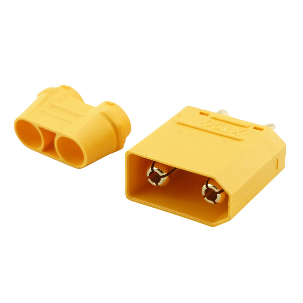 Power connector XT90 for high currents. The connector includes a cable cover, so there is no need to insulate soldered joints with heat shrink tubing. The male is used on the drone side.