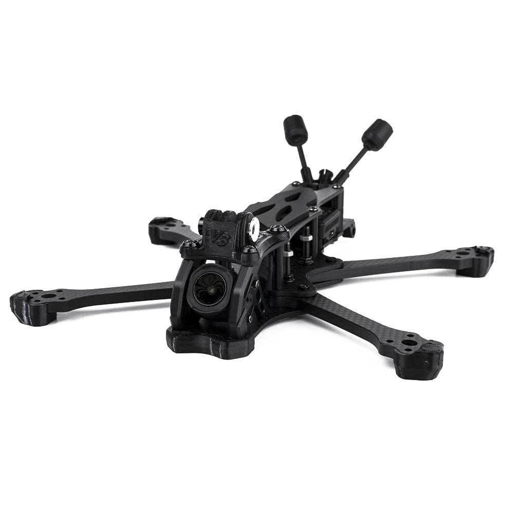 For maximum strength, the arms are milled from 5.5mm Toray T700 carbon. The front camera mount is made of durable 7075 aluminum alloy, with the camera secured via soft softmounts that dampen vibrations. The frame accommodates stacks with mounting hole spacing of 30.5×30.5 mm and 20×20 mm. There is space in the rear for a video transmitter with mounting hole spacing of 20×20 mm or 25.5×25.5 mm. The frame also includes an aluminum heatsink that ensures efficient heat dissipation from the video transmitter.