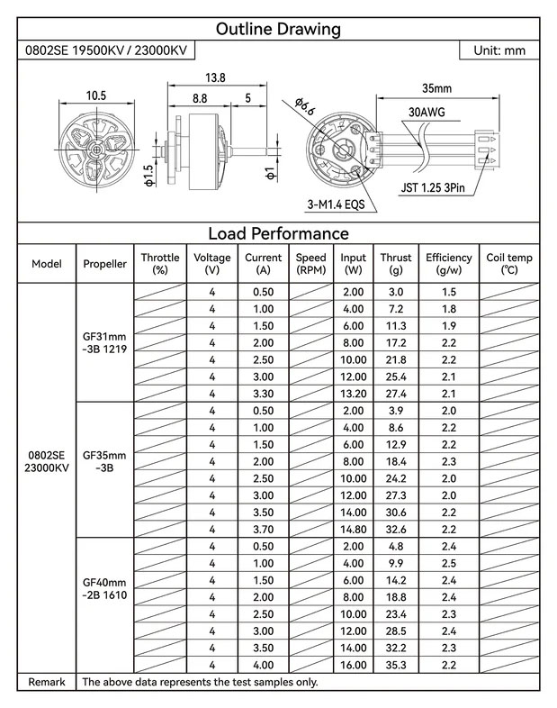 BETAFPV 0802SE 23000KV is an ultra-lightweight motor designed for 1S TinyWhoop drones in the 65–75 mm size range. The 23000KV variant is ideal for faster and more aggressive flights focused on high performance. The motor features a brass bushing instead of traditional bearings, ensuring minimal weight. It comes with a 1 mm shaft and 35mm silicone wires equipped with a connector. The motor leads are soldered directly to the PCB, making repairs easier in case of disconnection.
