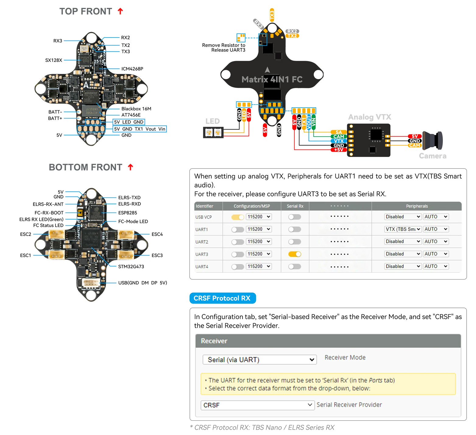 RC transmission is provided by the integrated ELRS 2.4 GHz receiver connected via UART. UART connection is available on the board, and if needed, the integrated receiver can be disconnected and an external one can be connected. The internal ELRS receiver uses a wired antenna powered directly on the board.