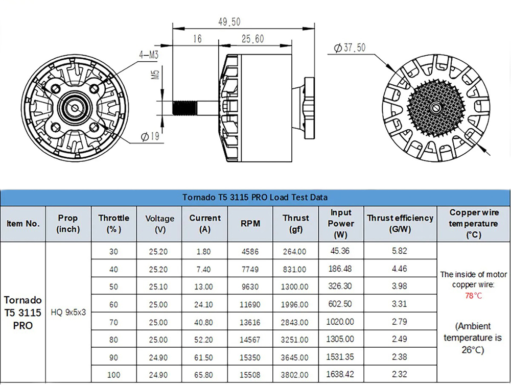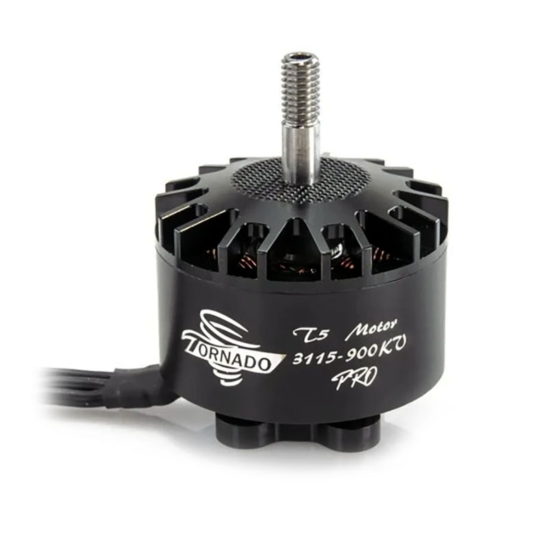 BrotherHobby Tornado T5 Pro 3115 900Kv is a top motor suitable for 9-10" propellers. The motor is made from 7075 aluminum alloy, utilizes high-quality Japanese bearings NMB 11x5x5, and rounded magnets N52H. For lower weight, the hollow shaft is made from titanium alloy. The motor has 30cm 16AWG cables with a total weight of 116 grams.