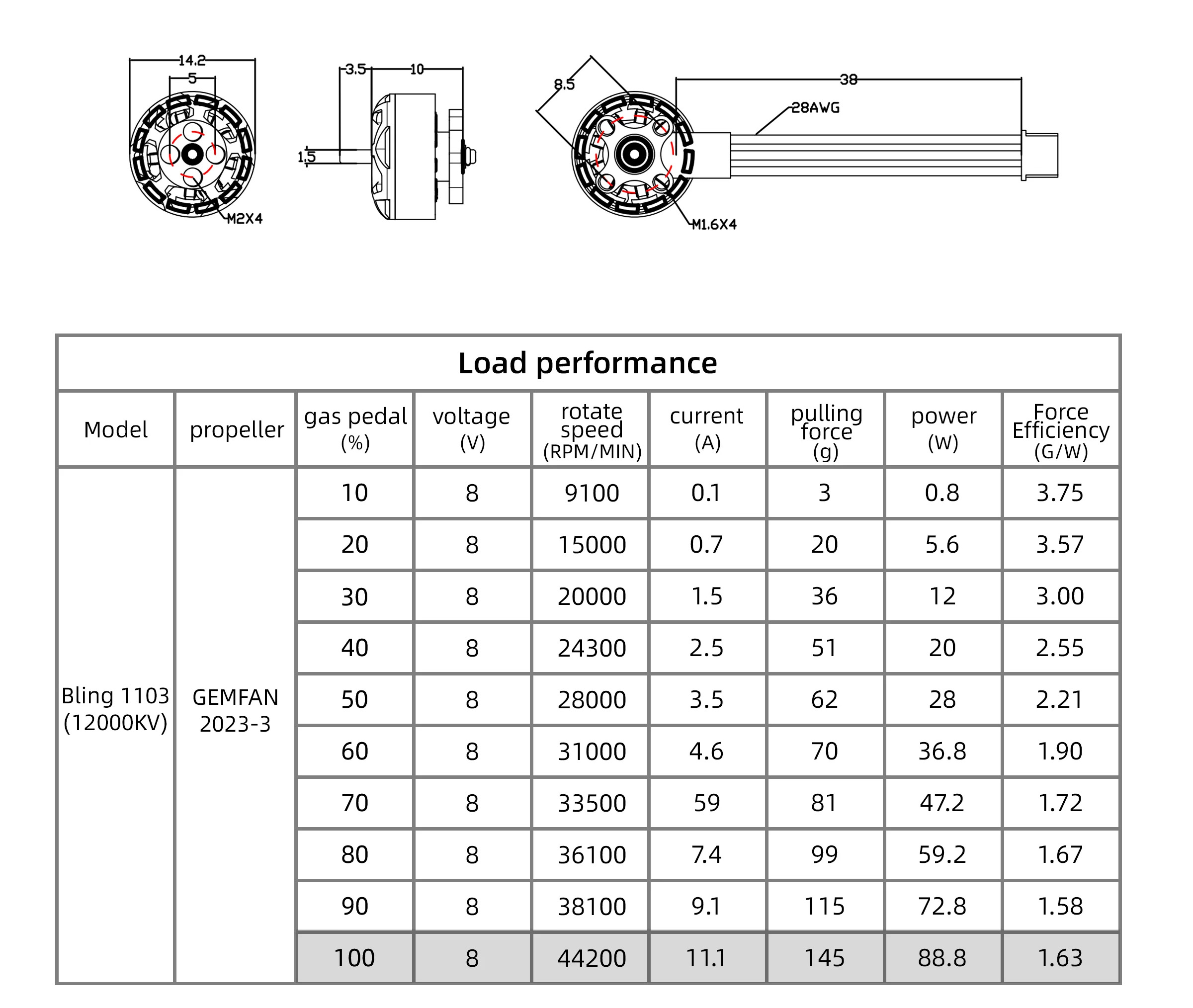 The Bling series features a distinctive glossy finish. The motor has a 1.5mm shaft and mounting holes sized M1.6 on a circle with a diameter of 8.5mm. The cables are terminated with a connector for easy attachment to the flight controller.