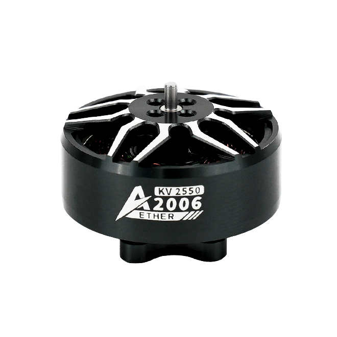 DeepSpace Aether 2006 2550Kv is a motor suitable primarily for 3-3.5" freestyle drones and Cinewhoops with 6S batteries or 5" ultralights with 4S batteries. The motor weighs 23 grams including 15cm 20AWG wires. The motor bell is in unibell design.