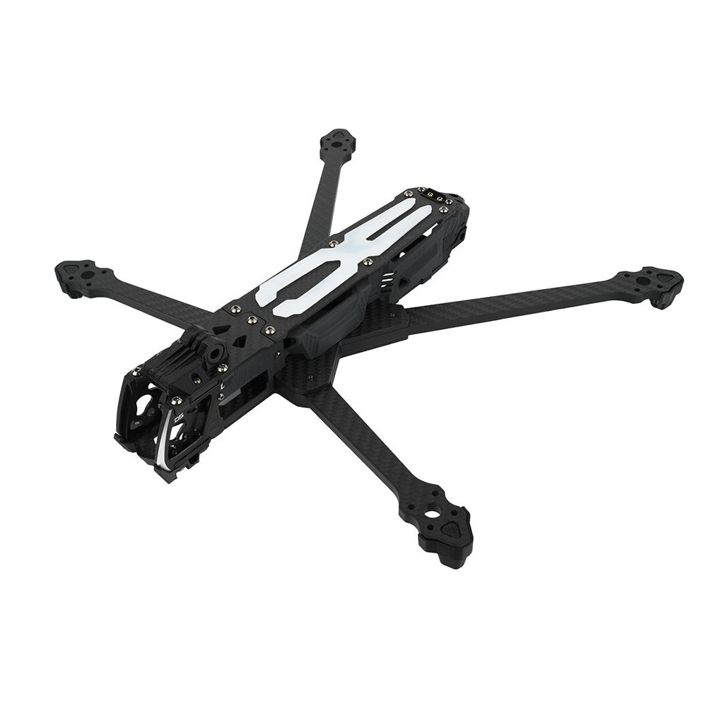 The frame is made of durable T700 carbon. The top plate is split for easy access to the electronics in case of service. The drone is equipped with 3D printed side panels that protect the electronics from dirt while allowing airflow for good cooling. In the middle section of the drone, there is space for mounting a stack with mounting holes 20×20 mm and 30.5×30.5 mm. The USB-C connector can be routed to the rear of the frame for easy access. The XT60 connector is firmly attached to the top plate. At the rear, there is space for mounting an analog video transmitter.
