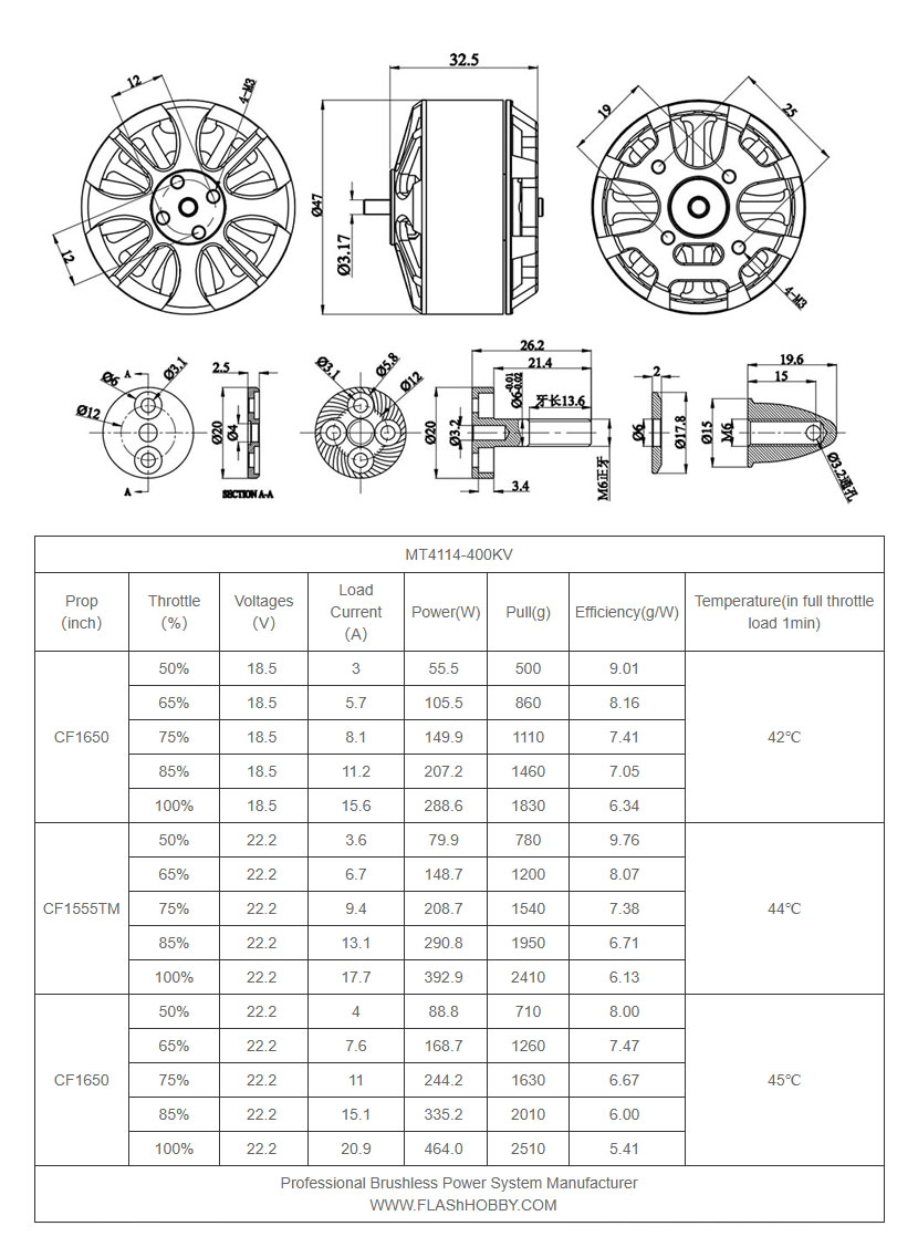 Flashhobby 4114 400Kv is a motor suitable for drones with 15–17″ propellers and a 6S battery, which focus more on long flight time than high performance. The motor uses 48SH class magnets and copper winding with high thermal resistance. The motor bell is made from aluminum 6061-T6, providing a good strength-to-weight ratio. Smooth operation is ensured by high-quality NSK/NMB bearings.