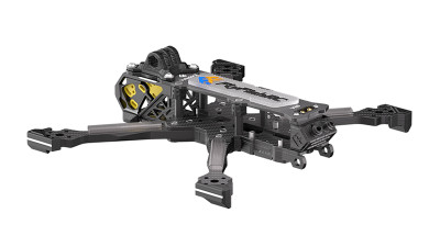 The frame is cut from premium T700 carbon fiber, which offers superior strength compared to standard T300 carbon. The 6mm thick arms provide exceptional durability in crashes and help reduce vibrations transmitted to the flight controller. The craftsmanship is excellent—beveled edges prevent wire damage, and grade 12.9 steel screws with pre-applied Loctite ensure secure and vibration-resistant fastening. The camera is protected in a metal holder made from robust 7075 aluminum alloy, the same material often used in high-end drone motors. It is mounted in a silicone insert that absorbs vibrations and improves video quality. The frame includes a variety of 3D prints, such as arm guards, a GoPro mount, and a GPS holder. A silicone battery pad on the top plate provides grip and helps prevent battery ejection in crashes. The XT60 connector is firmly mounted to the top plate, preventing the battery wires from being cut by the props.