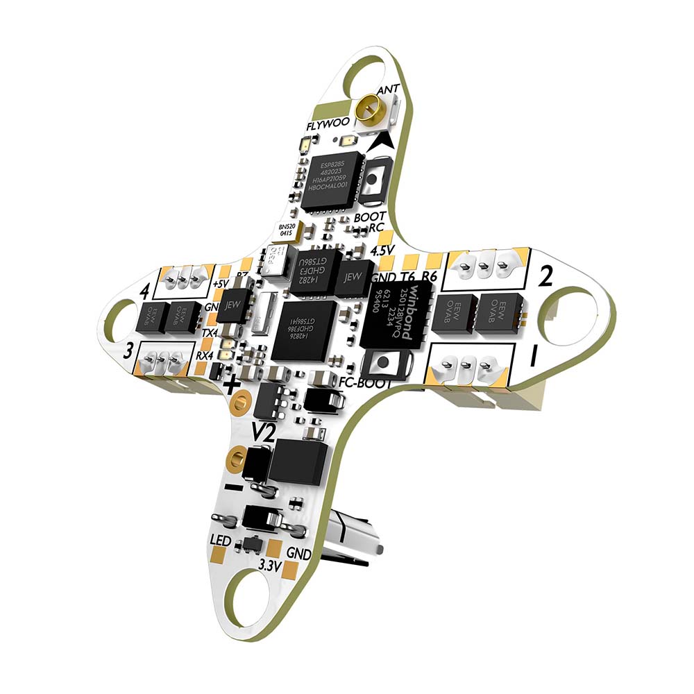 Flywoo GOKU F405 HD 1S 5A AIO V2.0 is a lightweight AIO board for 1S Tinywhoops with digital video transmission. The board combines a flight controller, ESCs, and an ELRS receiver. The unit weighs only 2.6 g and its cross shape is compatible with all popular 1S frames. Thanks to the built-in 5V BEC module, it can reliably power the digital transmission of DJI O4, HDZero, or Walksnail Avatar.