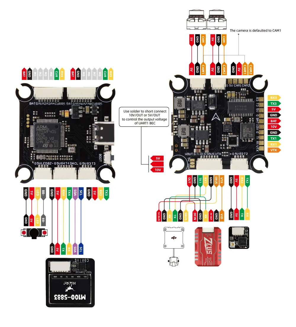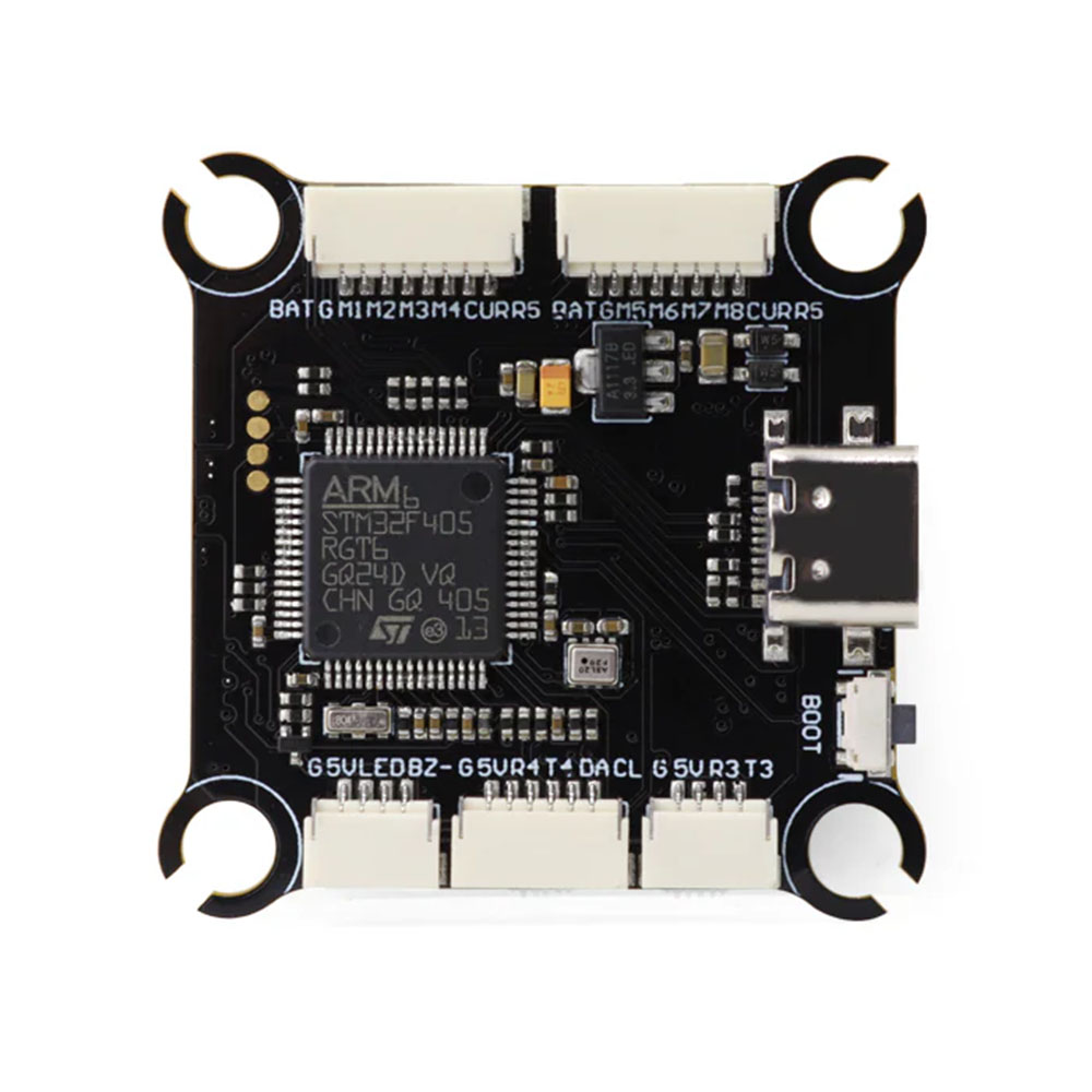 The core of the flight controller is the F405 microprocessor complemented by the ICM42688P gyro. The board also includes a barometer for altitude measurement and 16MB of memory for blackbox. An advantage is the ability to connect up to 8 motors and two cameras, which can be switched between. The board is equipped with connectors for easy wiring without soldering.