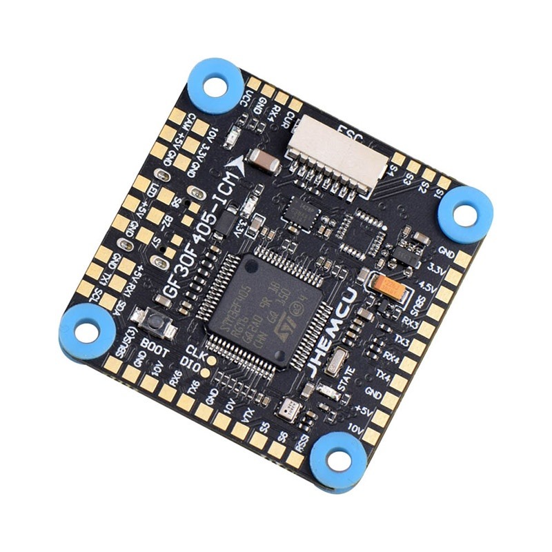 Jhemcu GF30F405 is an affordable flight controller with a mounting hole spacing of 30.5x30.5mm. The board is mainly suitable for freestyle and long-range 3-8S Lipo powered drones. The core is the F405 processor combined with the ICM-42688-P gyroscope. The board also features an integrated SPL06 barometer for altitude measurement and 16MB memory for blackbox. The board is equipped with a chip for analog OSD. It has 4 UARTs, I2C pads, 5V/3A BEC, and 10V/2A BEC.