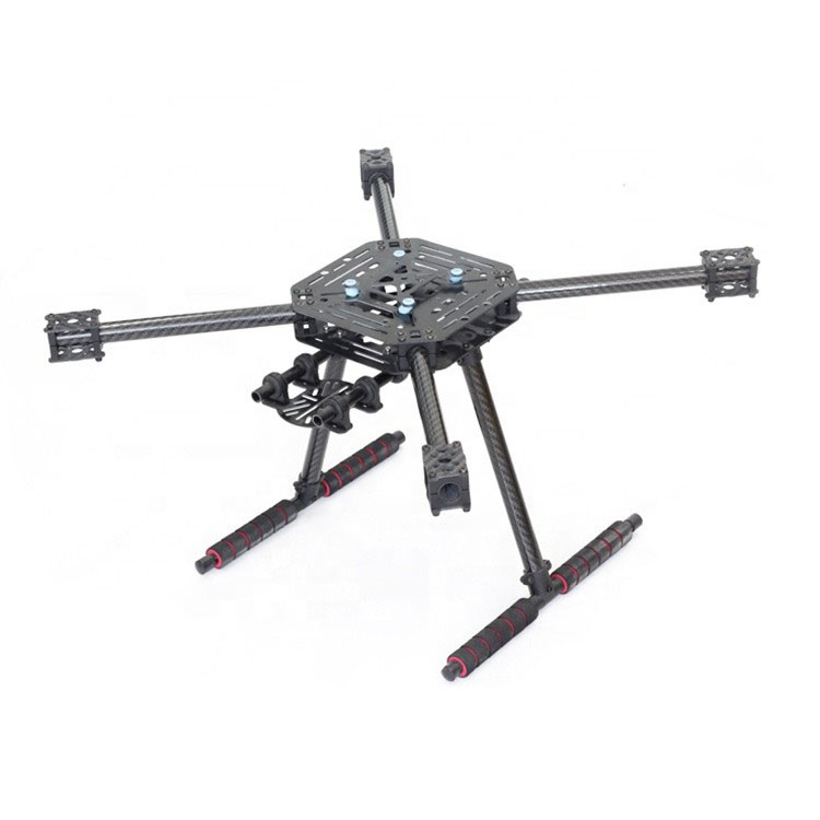 The frame is made of a combination of carbon plates and tubes. Motors are mounted on carbon holders at the ends of the arms. The frame can be built in both X4 and X8 configurations for greater thrust. The center plates provide enough space for mounting a flight controller, power supply, and other electronics. On the underside of the drone, there are two fiberglass tubes that serve as a universal platform for mounting any payload.