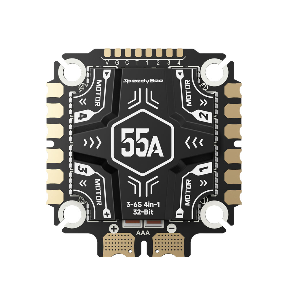 Speedybee OX32 55A is a 4in1 regulator that can handle a current of up to 55A and power from 3-6S Lipo batteries. For better current transmission, the regulator uses nickel current buses. It is equipped with an aluminum heat sink that helps dissipate heat while protecting the electronics from dirt. The regulator includes a current sensor and a TVS diode for protection against voltage spikes. The regulator uses the firmware OX32, which is an alternative to BLHeli_32. You can use the OX32 configurator for setup.