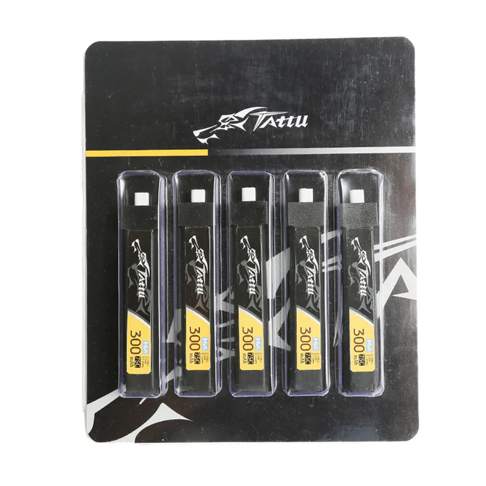 Set of five pieces Tattu 300mAh 1S batteries with BT2.0 connector. The batteries are primarily suitable for the smallest Tinywhoops of size 65mm with a 31mm propeller.