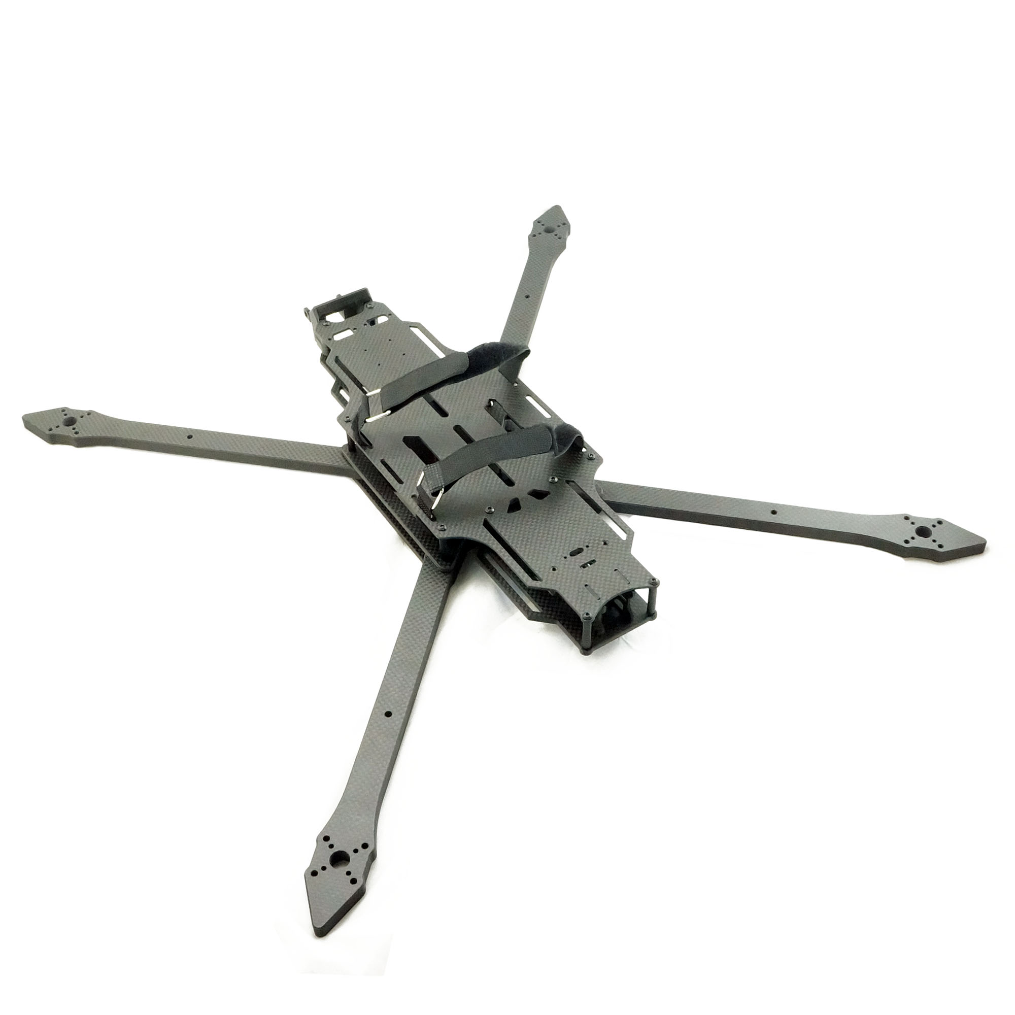 Massiver Frame für den Bau eines Long-Range-Drohne oder Cinelifters, geeignet für Propeller bis 13". Der Frame verfügt über einen großen Rumpf mit viel Platz für die gesamte Elektronik. Die Arme bestehen aus 10mm starkem und 24mm breitem T300-Carbon. In den Armen befinden sich M3-Gewinde zur Befestigung von Zubehör oder Verstärkungen (nicht im Lieferumfang enthalten). Unterstützt werden Motoren mit 19mm M3- und 30mm M4-Lochkreis. Die Innenhöhe des Rumpfes beträgt 25mm und kann durch längere Abstandshalter vergrößert werden.