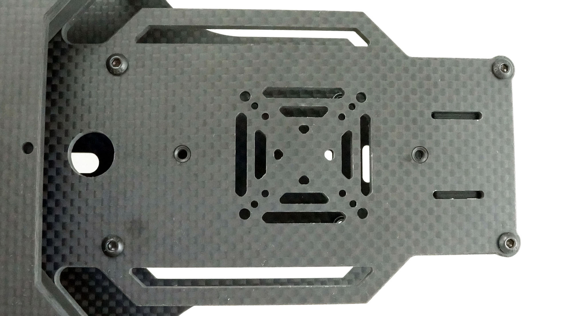 Die obere Platte bietet Platz für die Befestigung von Akkus mit speziellen Aussparungen für LiPo-Straps. Es können zwei Akkus nebeneinander oder ein größerer Akku mit einer Breite von ca. 10cm und einer Länge von ca. 15cm montiert werden. Ebenso passen schmale, längere Akkus mit ca. 6cm Breite und ca. 27cm Länge.