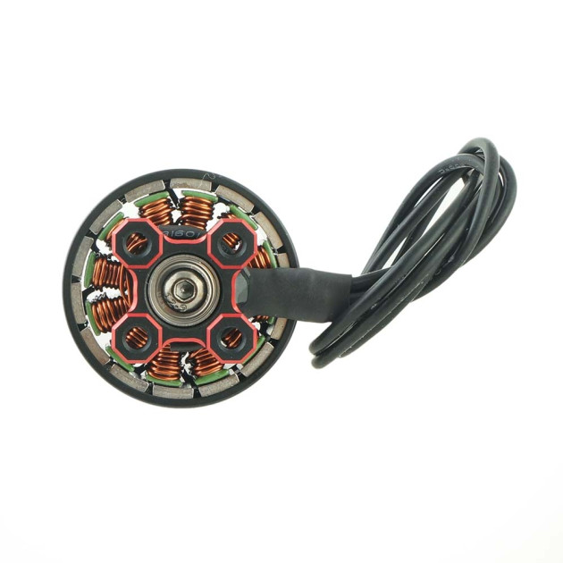 Motors are labelled with four digits such as 2306 or 2207. The first two indicate the stator diameter in millimetres, the last two the stator height. Stator size determines the stator volume (copper + magnetic field) the motor can use — and thus its torque.