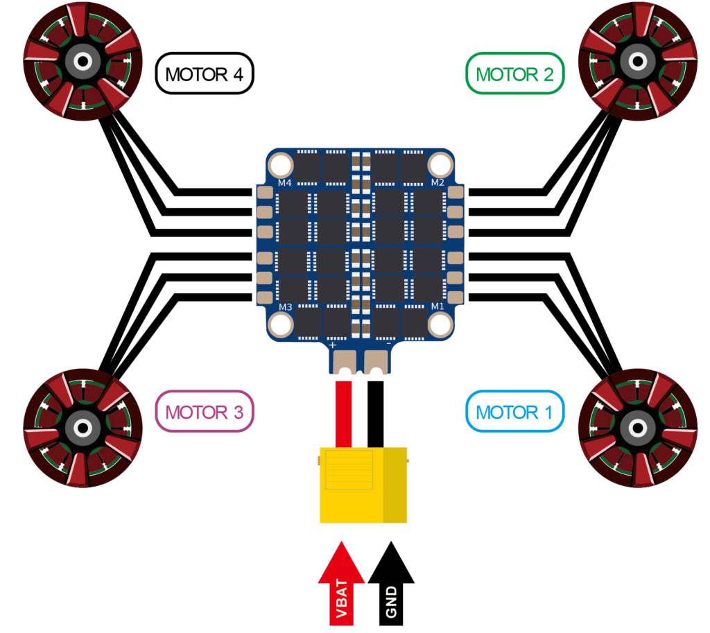 Many ESCs include a current sensor and send telemetry to the FC. It’s common to add an external electrolytic capacitor at the ESC/battery leads to suppress voltage spikes from rapid RPM changes — this significantly extends the life of the ESC and other electronics.